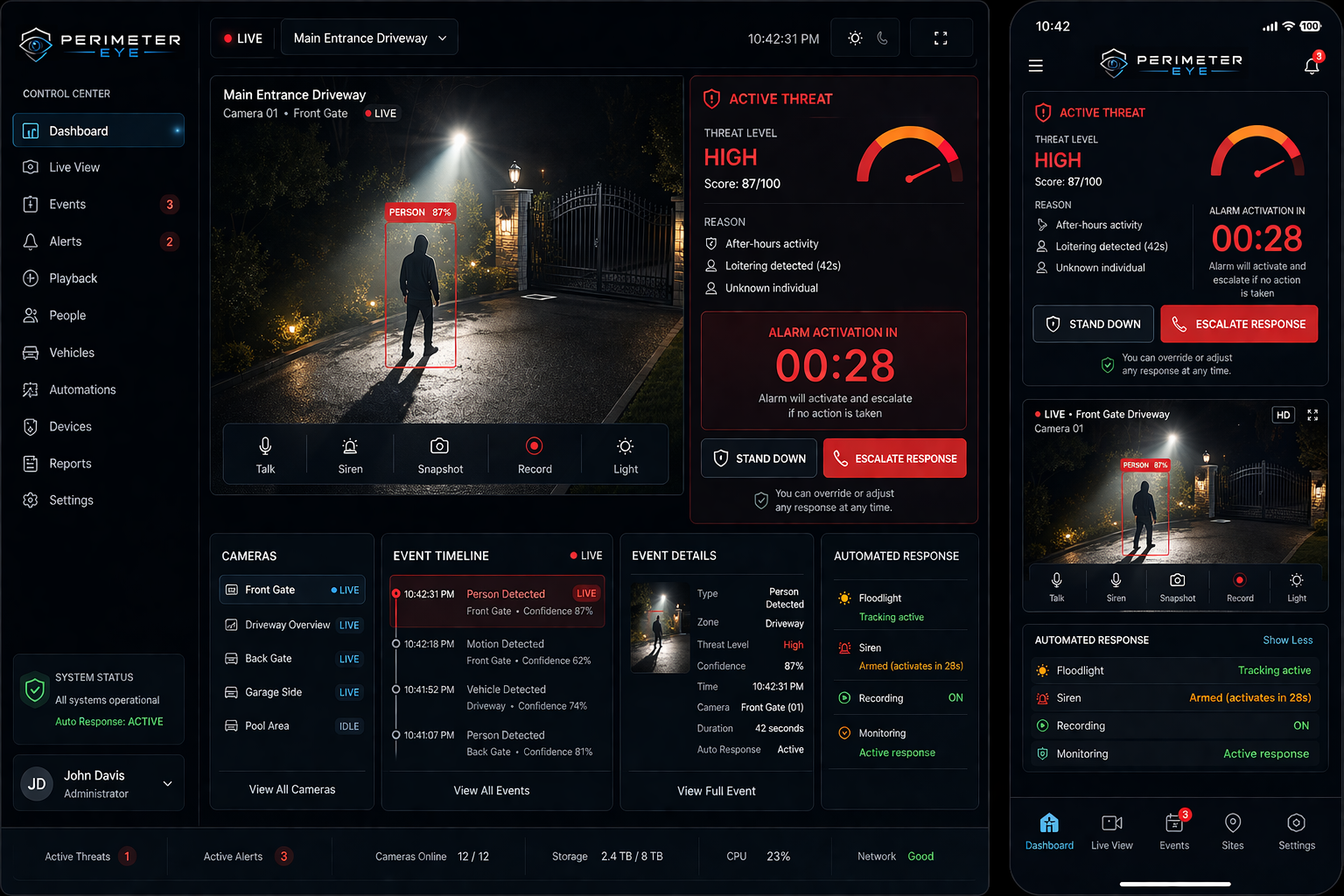 PerimeterEye monitors your property in real time, identifies suspicious behavior, and triggers instant alerts before small signals become serious incidents.